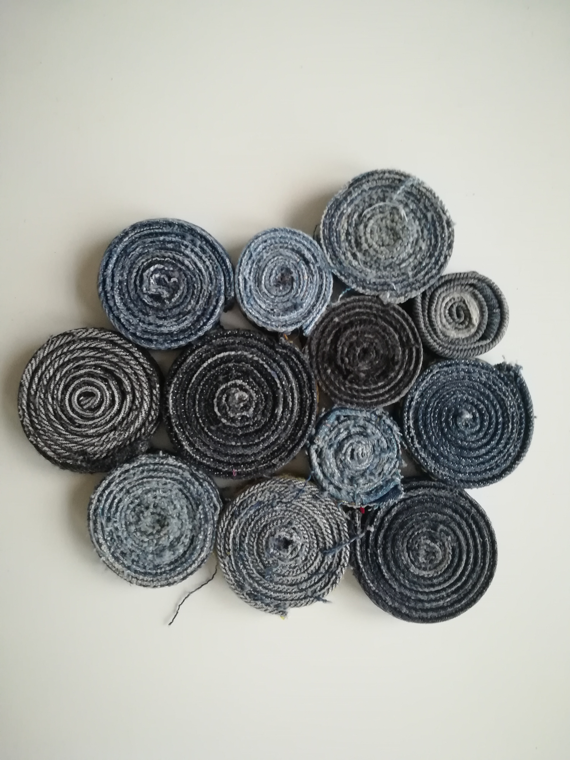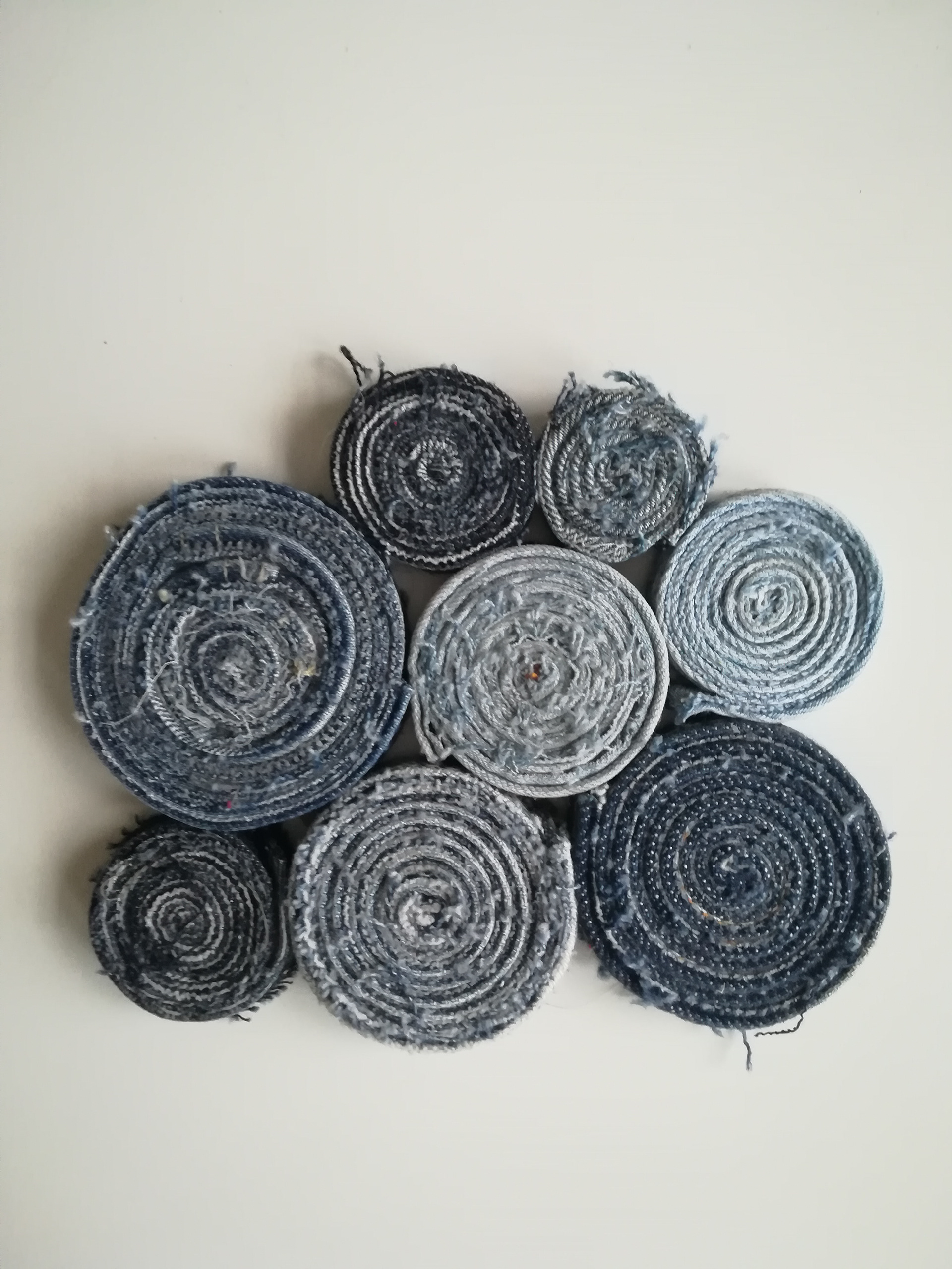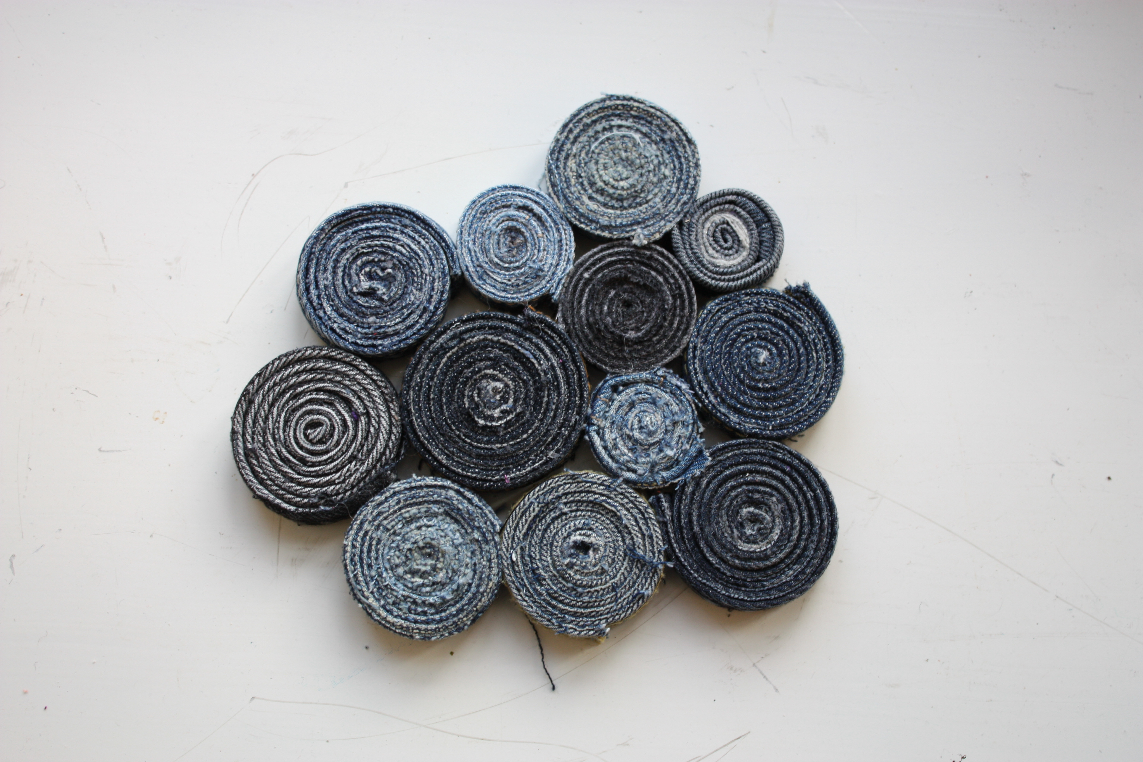 Grytunderlägg av jeans-sömmar som är rullade och ihoplimmade. Se gärna mer under projektet om jeansåtervinning.
