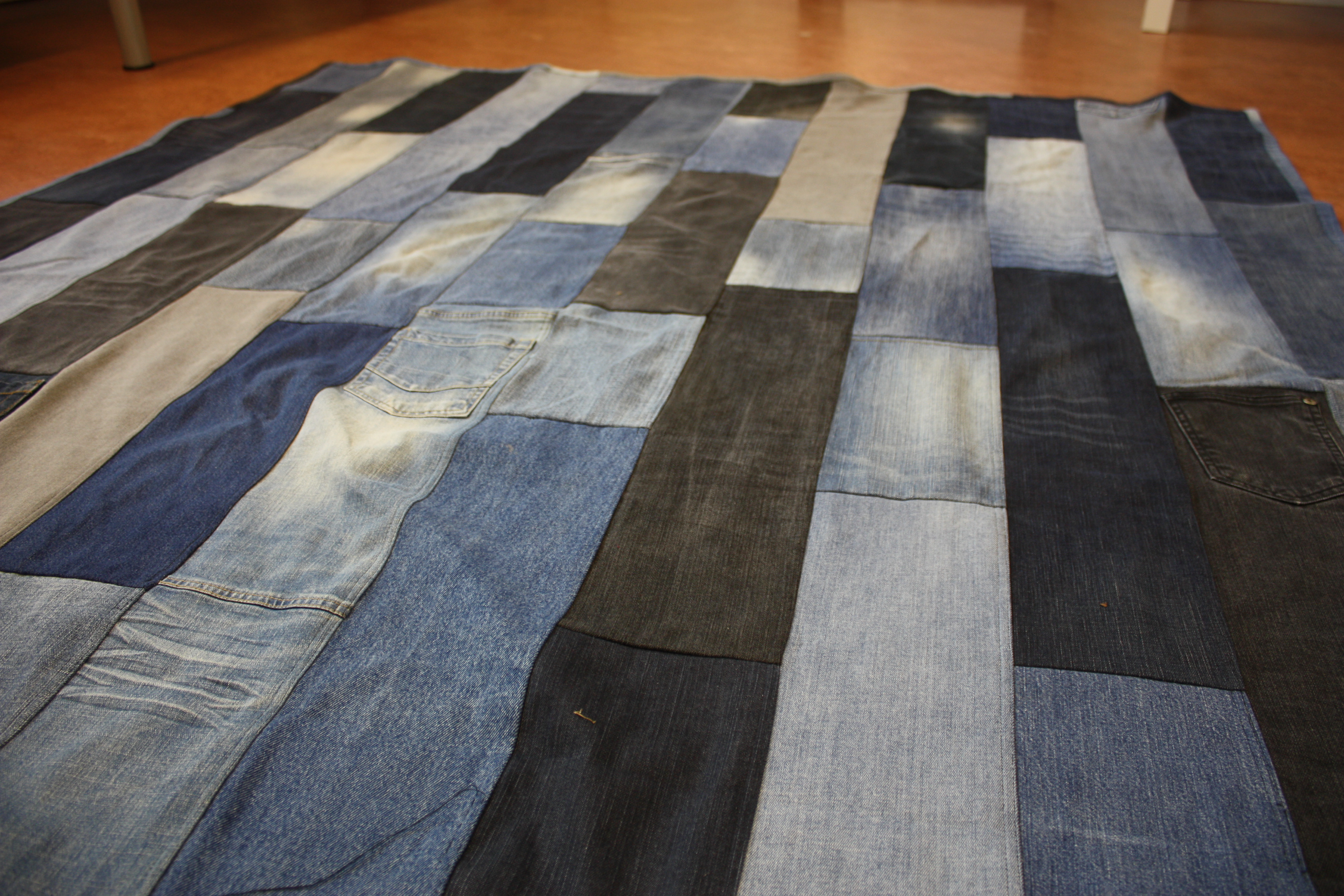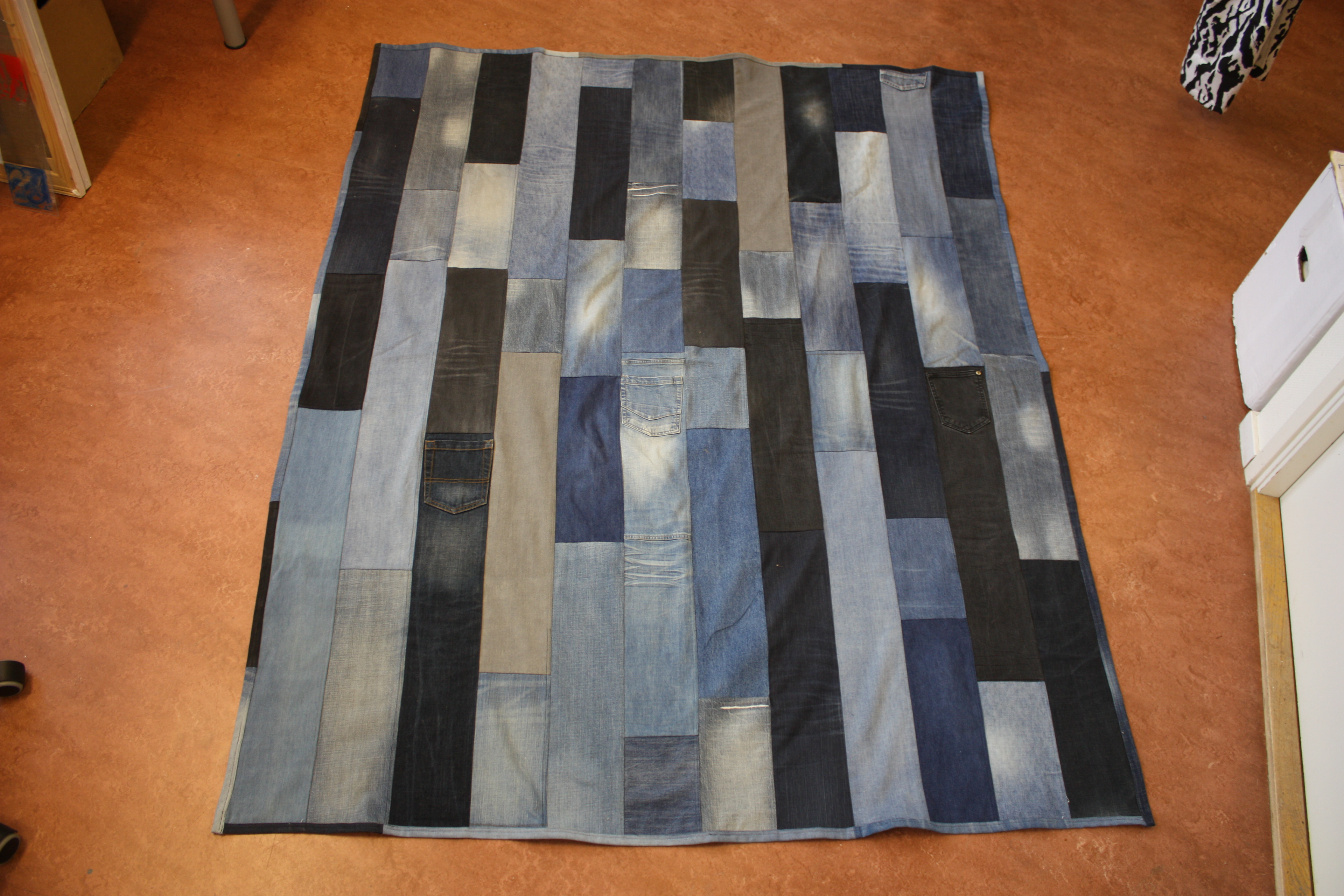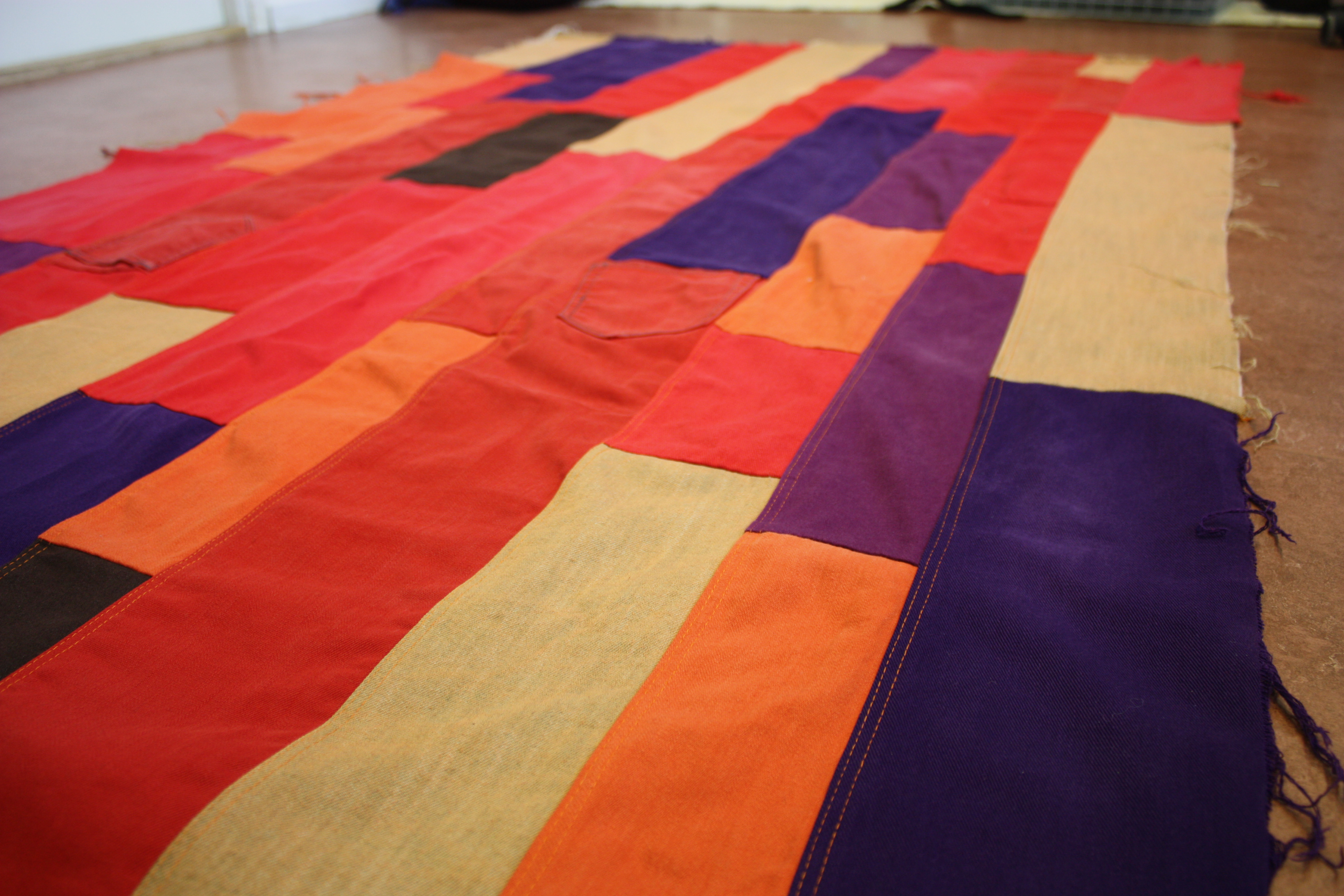 Först klippte jag jeansen i olika delar - benens tygstycken, sömmarna och fickorna. Tyget blev långa stycken som jag sydde samman till en matta. De två som är färdiga nu är en i traditionella blå toner och en i röda och lila färger. Storleken är ca 180cm * 120cm - den röda något mindre.