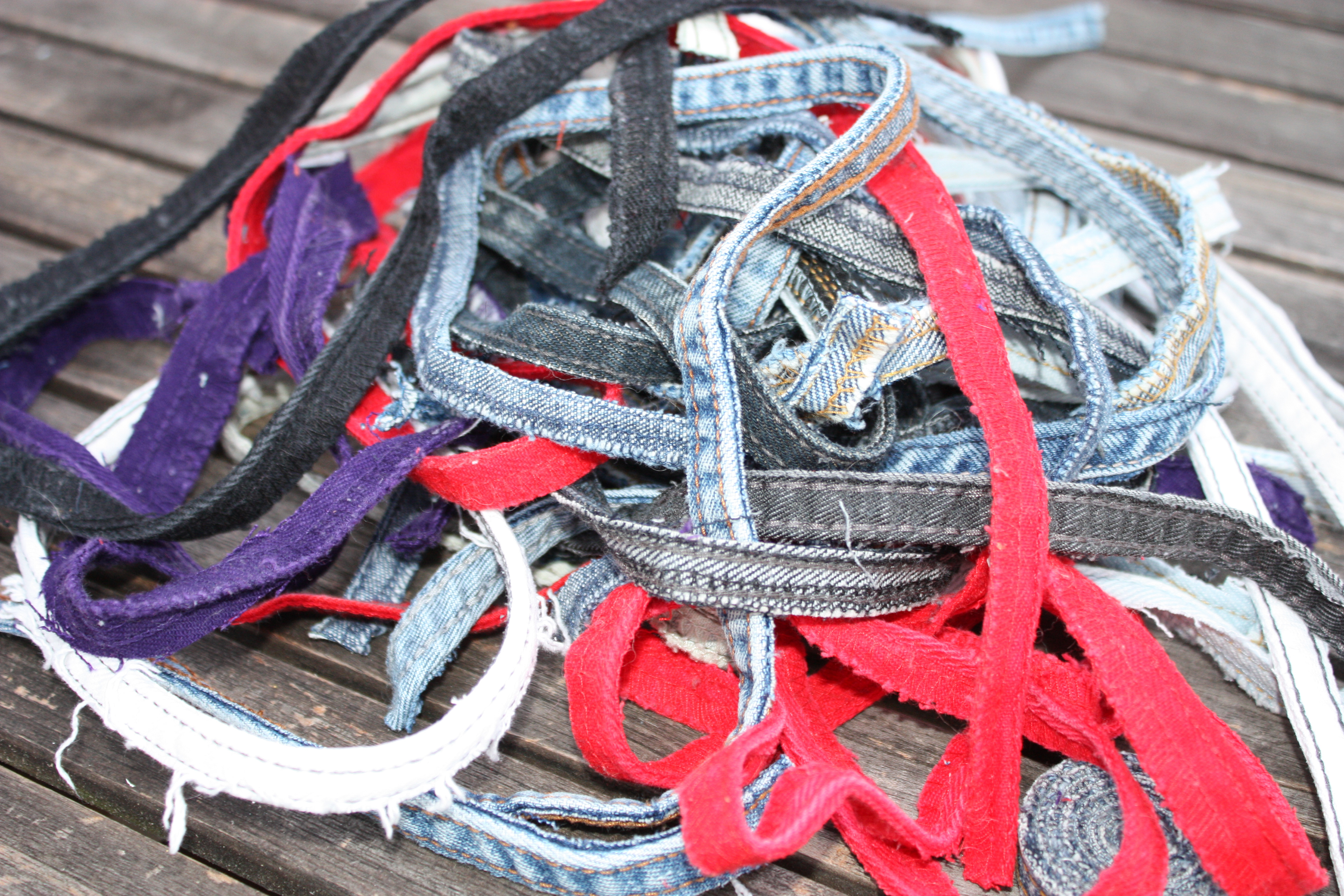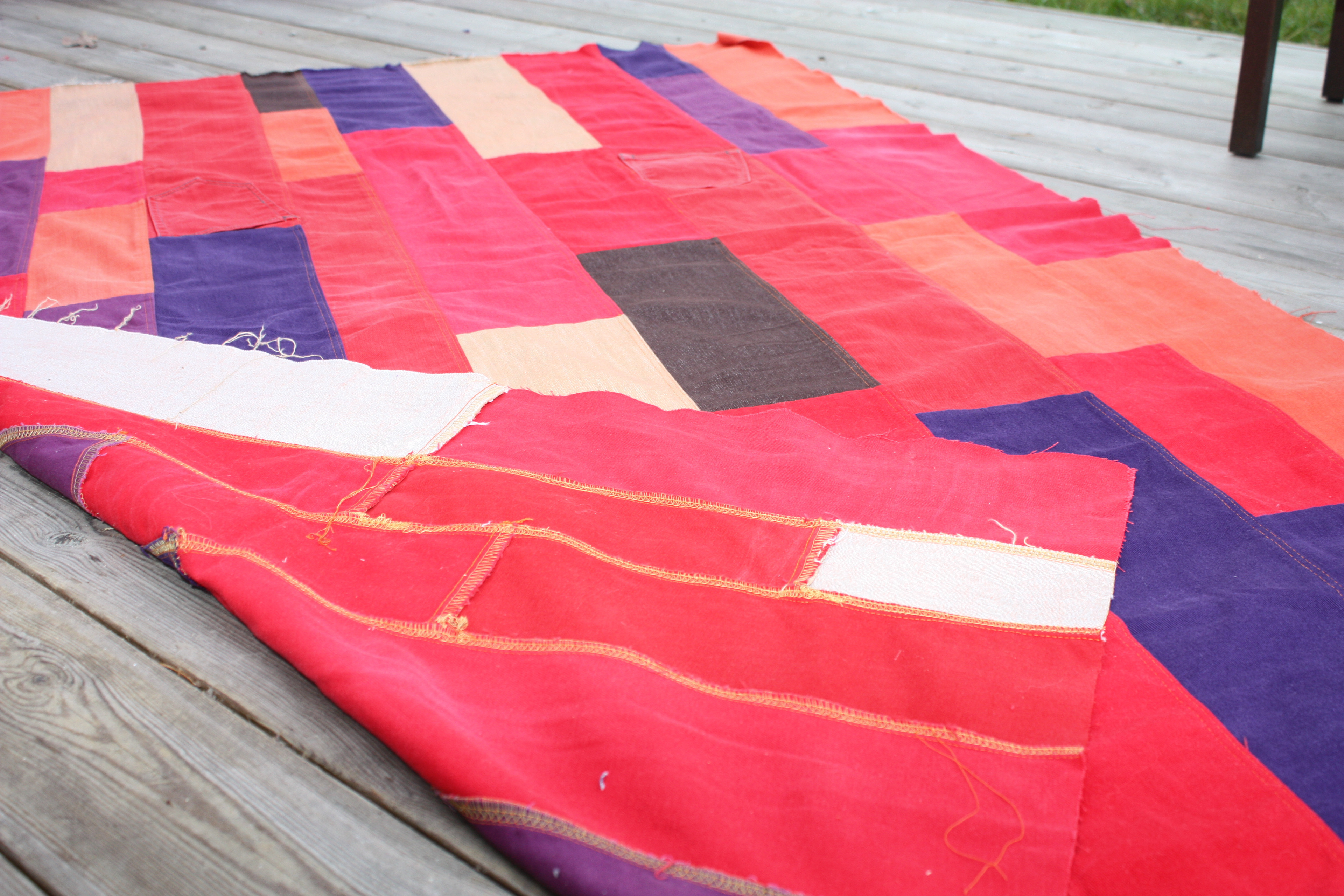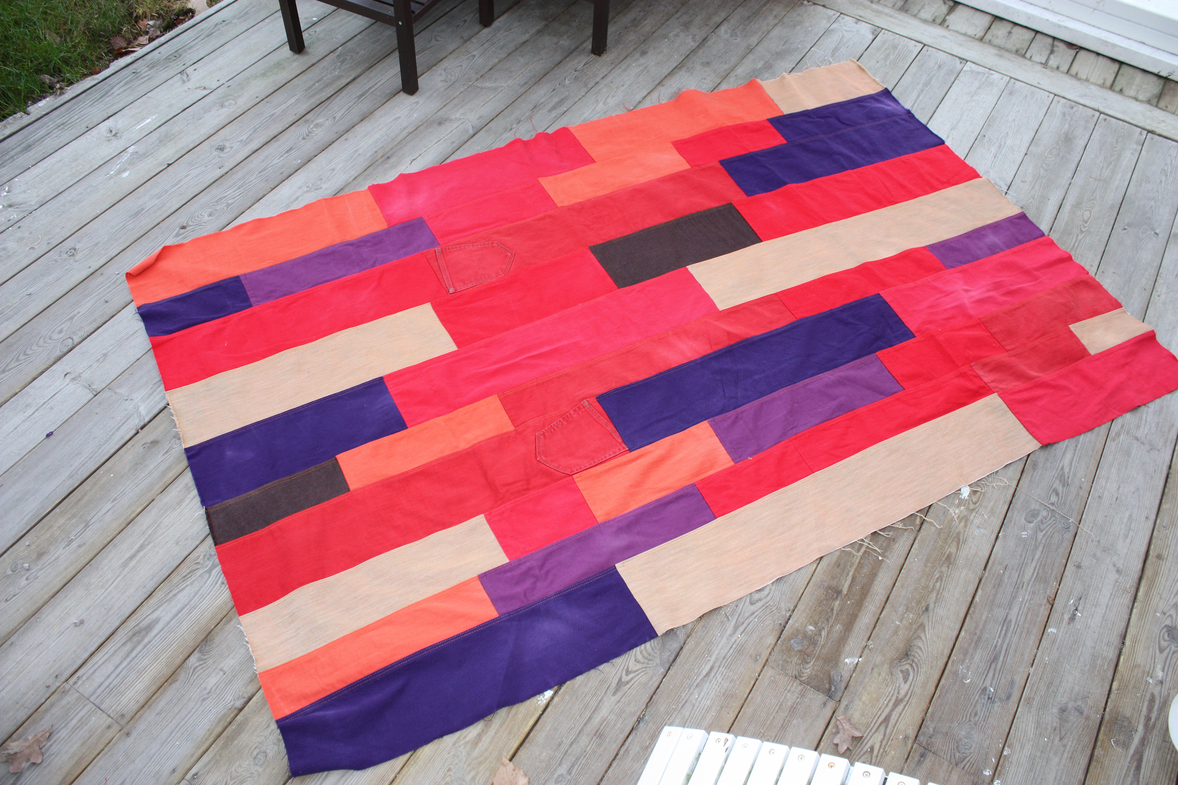 Först klippte jag jeansen i olika delar - benens tygstycken, sömmarna och fickorna. Tyget blev långa stycken som jag sydde samman till en matta. De två som är färdiga nu är en i traditionella blå toner och en i röda och lila färger. Storleken är ca 180cm * 120cm - den röda något mindre.
