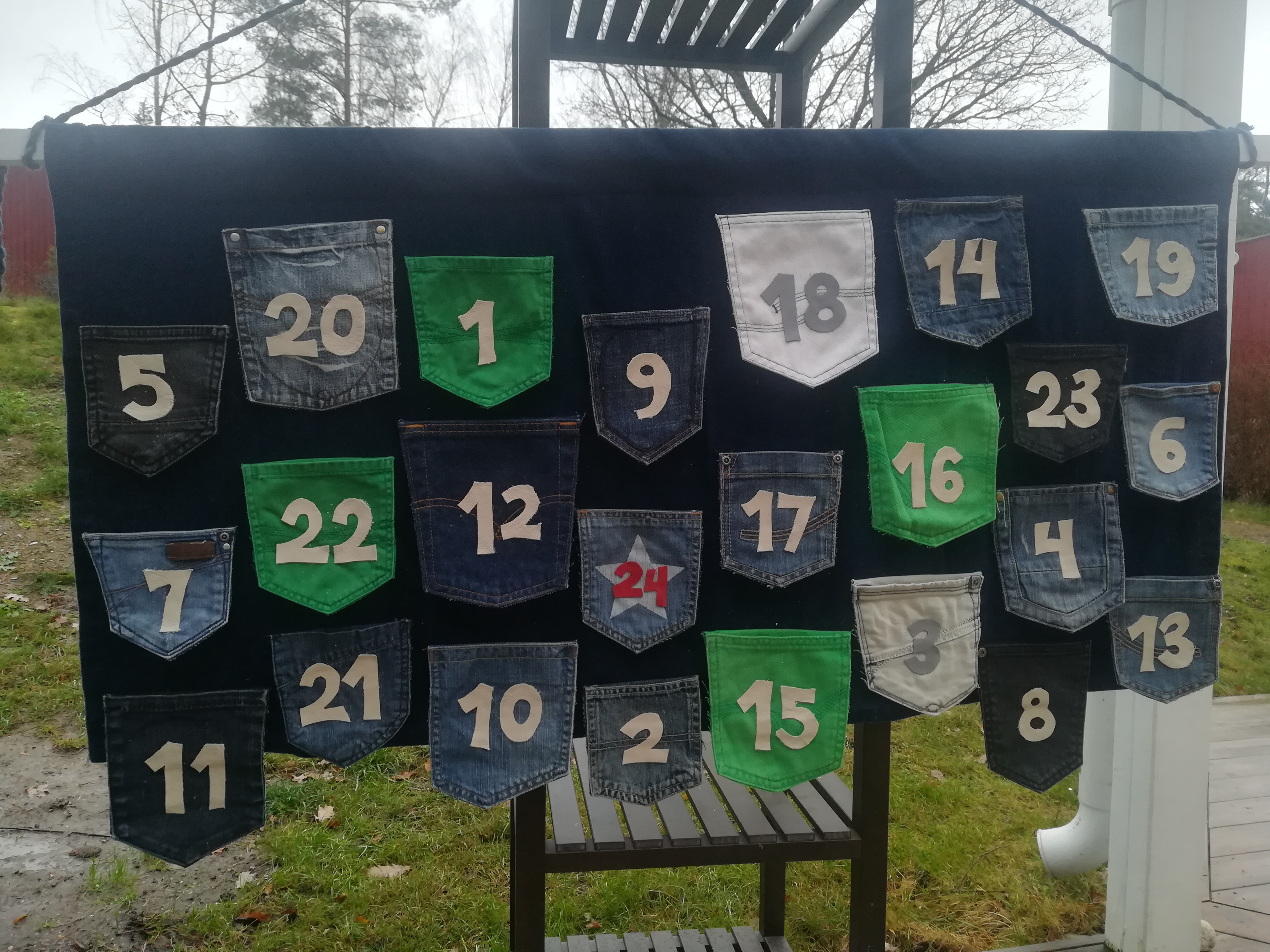 Eftersom det snart är jul, blev fickorna till två adventskalendrar. Jag har sytt fast fickorna i överkant och klippt ut siffror från en gammal skinnväska som jag limmade fast på varje ficka. Bakstycket är en gammal gardin av sammetstyg.