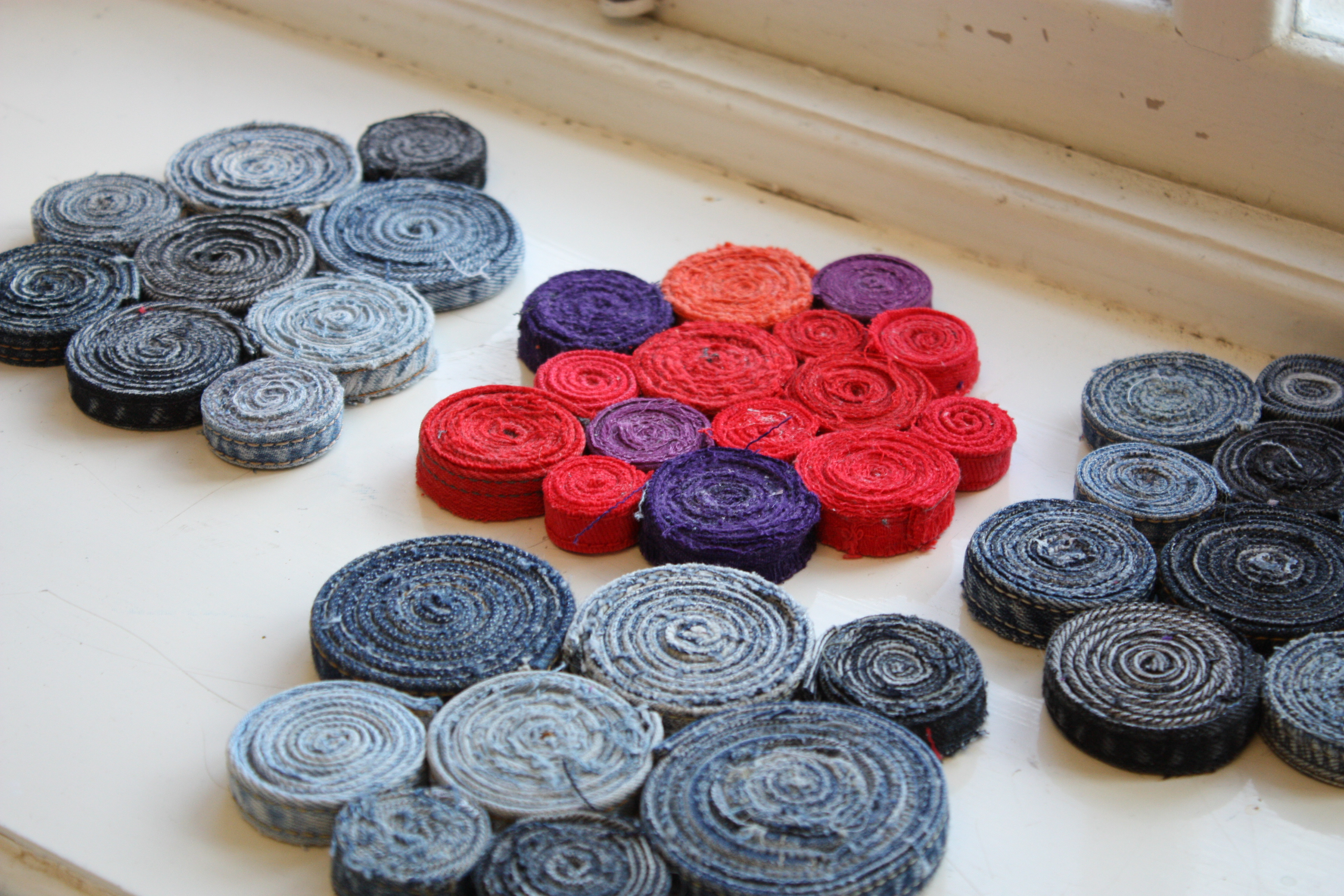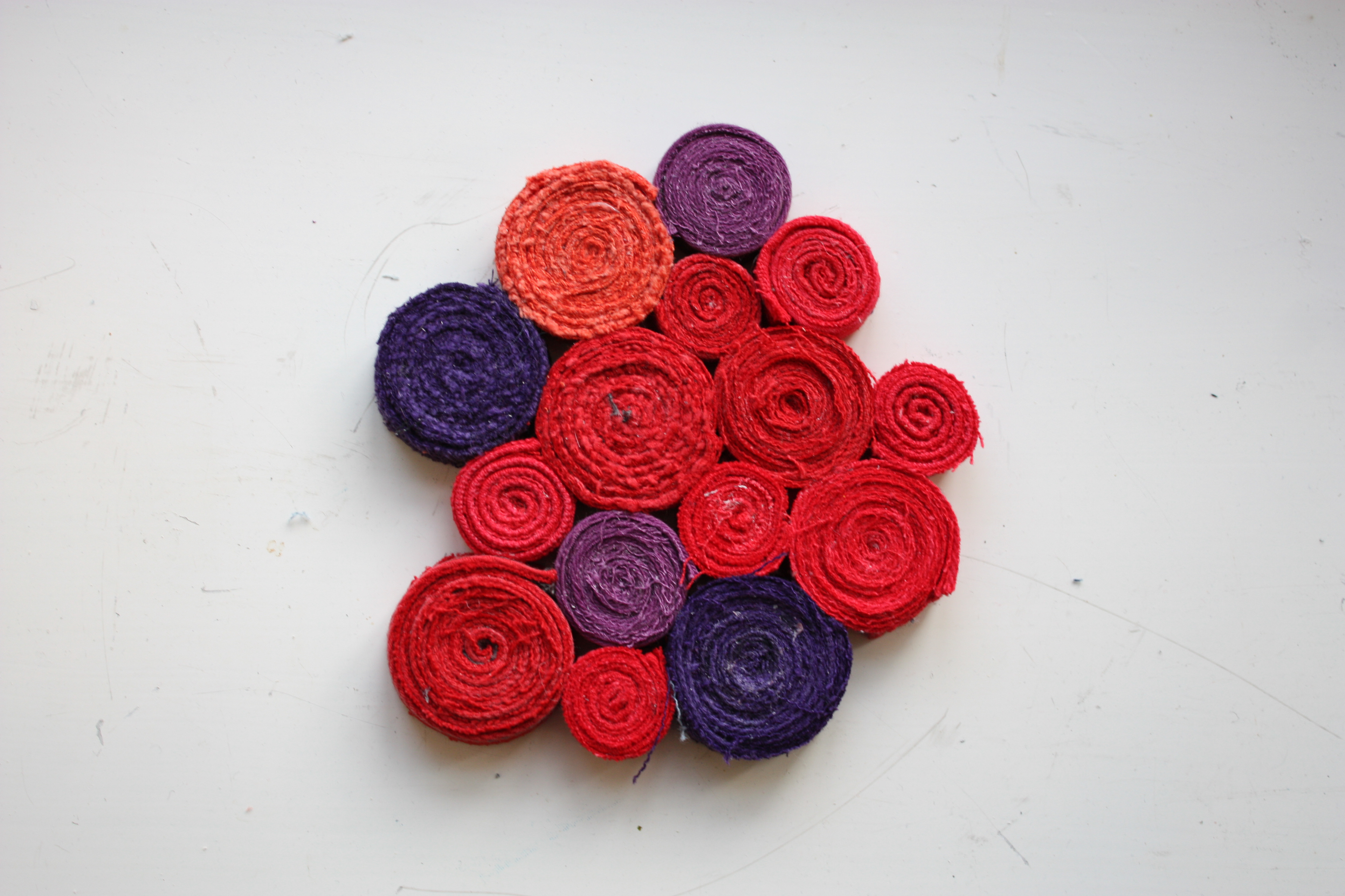 Sömmarna rullades till cirklar som sammanfogades och blev till grytunderlägg